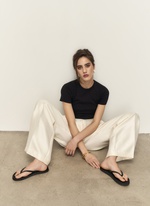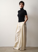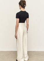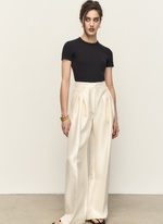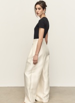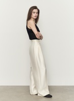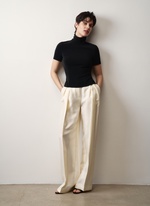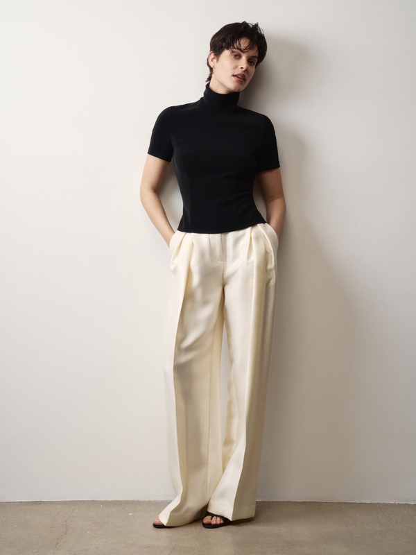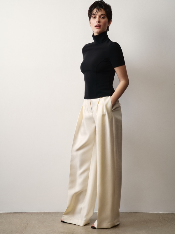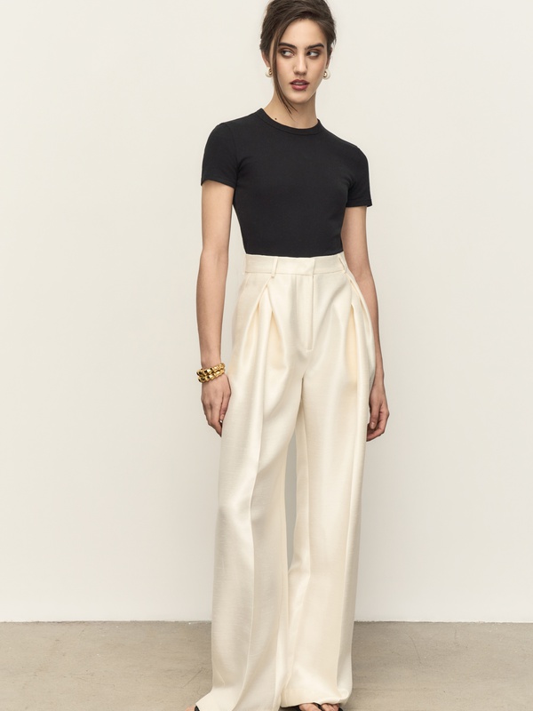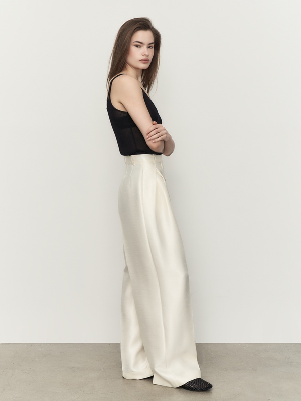 Брюки расслабленого силуэта с веерными складками. Выполнены из плотного фактурного материала с деликатным сиянием. Идеальны как для повседневных, так и вечерних выходов.