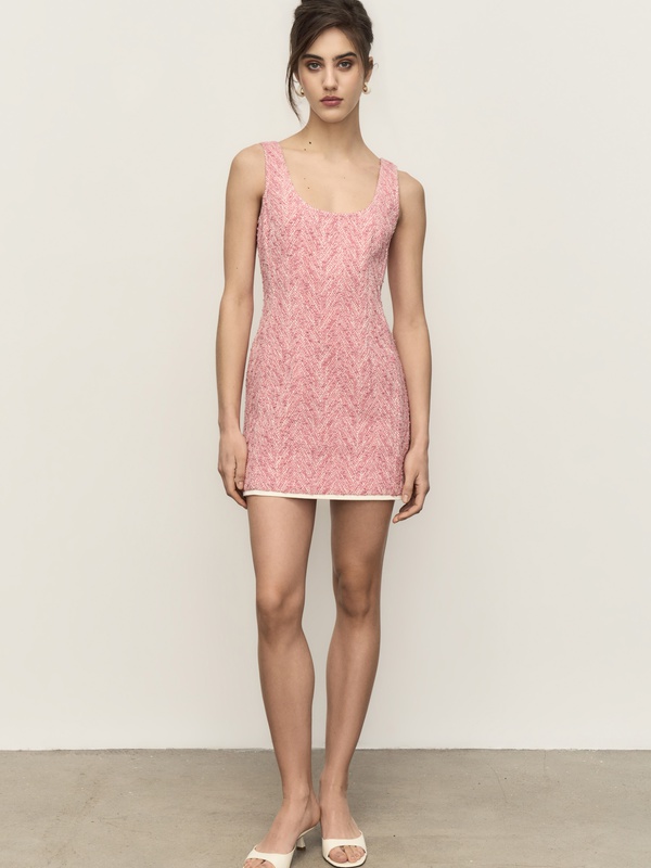 Нежное розовое платье с акцентным декольте и контрастной отделкой по низу.