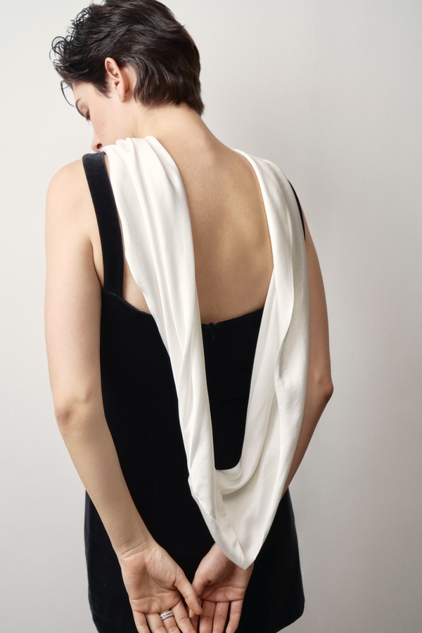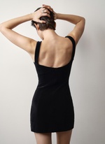 Идеальное лаконичное платье длины мини из черного бархата. Для придания большей выразительности рекомендуем сочетать с молочныс шарфом Keira.