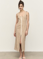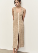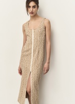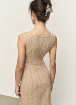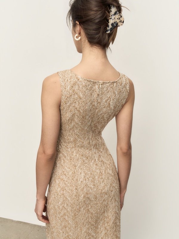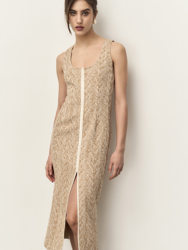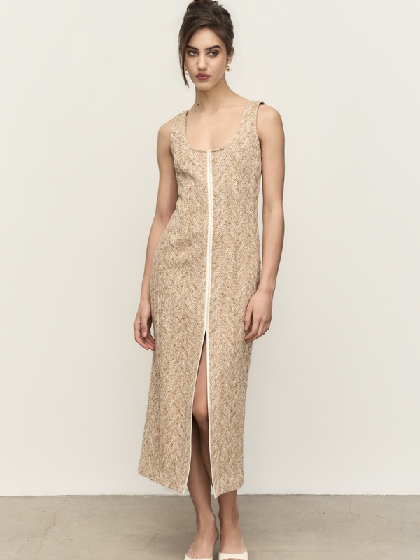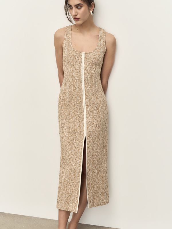 Платье с акцентным декольте и элегантным разрезом из плотного фактурного материала. Декоративный атласный элемент создает вертикальную линию, вытягивая силуэт.