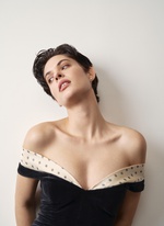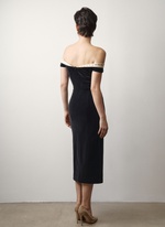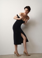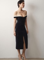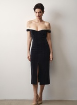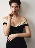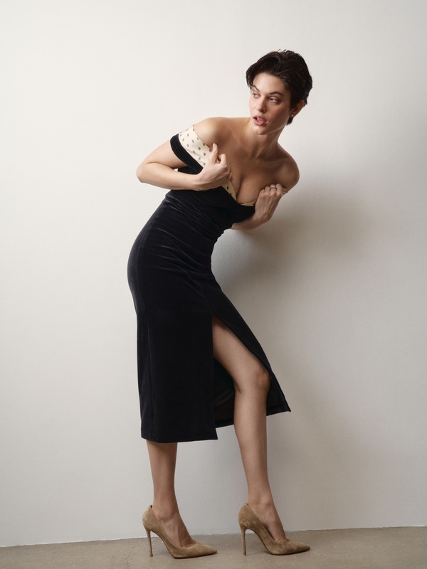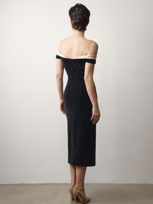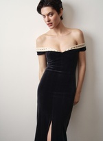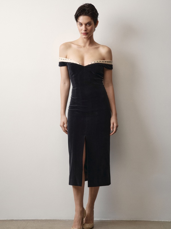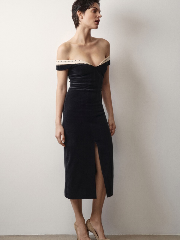 Женственное платье из бархата с изящным декольте, подчеркивающим хрупкость ключиц.