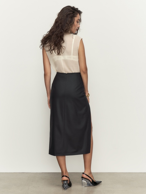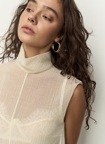 Блуза с высоким горлом из полупрозрачной шерсти нежнейшего переплетения. Выполнена в благородном кремовом оттенке.