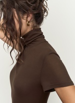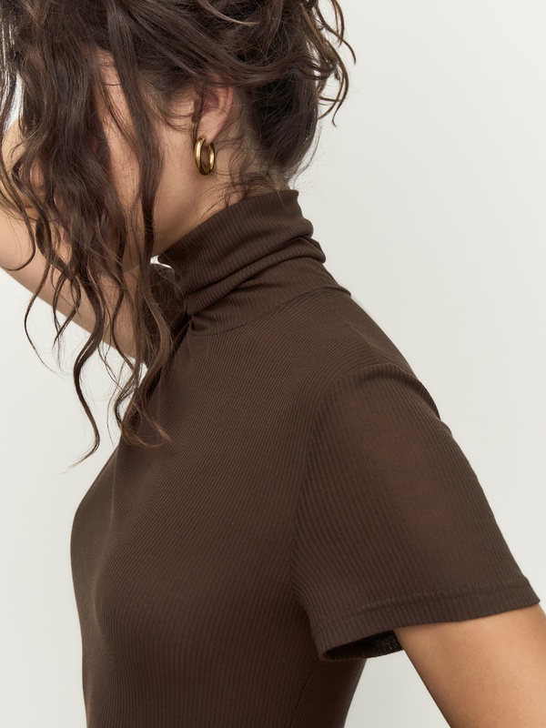 Трикотажный топ в рубчик с воротником-стойкой и коротким рукавом. Выполнен из тончайшей вискозы с добавлением шелка.